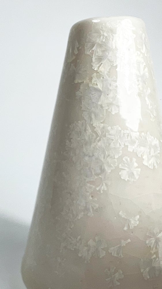 This vase is an edition of 100, slipcast in glacier white porcelain with a crystalline glaze. They come solo as an individual vase or paired with remnants of a past paper installation ("Please, Stay on the Trail")