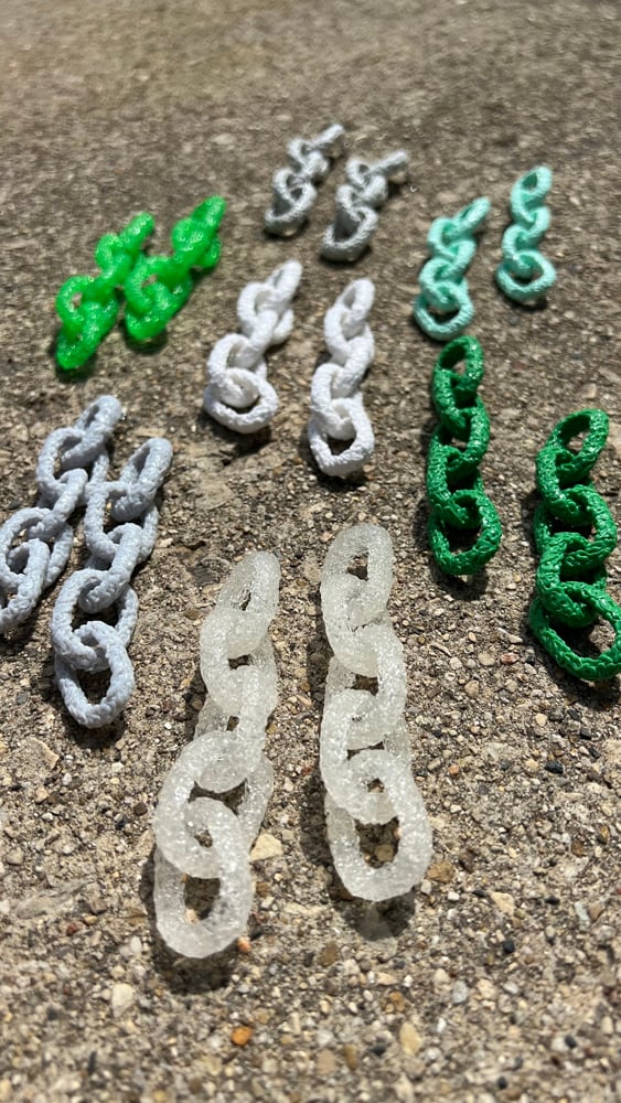 Drape your ears with a one-of-a-kind chain link earrings in seven colors: foam, air, fog, rock, land, sea, and ooze. Earrings are outfitted with surgical steel posts and backs.